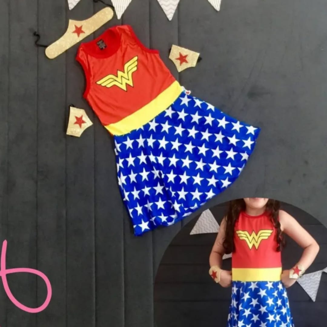 Linda Fantasia da Mulher Maravilha; pode ser usada em aniversário, Carnaval, halloween, festas de escola e onde mais a sua imaginação permitir.
