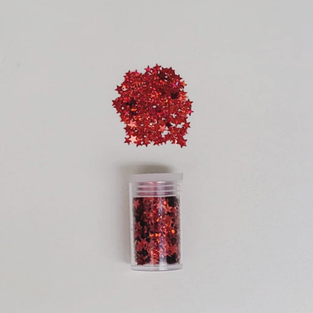 Kit com 12 potes de glitter formato estrelinha, ideal para festas.