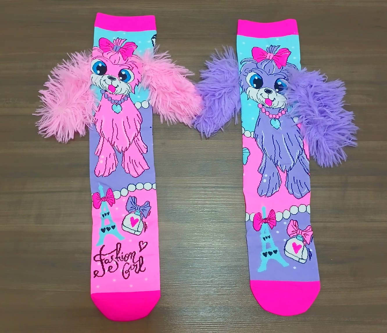 MEIA MALUCA 3D DIVERTIDA - CACHORRINHO ROSA/LILAS